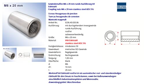 Manicotti filettati rotondi in acciaio inox A4, dado di collegamento, dado lungo, dado distanziatore V4A, versione rotonda M6, M8, M10, M12, M16, M20 (50, M6 x 20 mm)