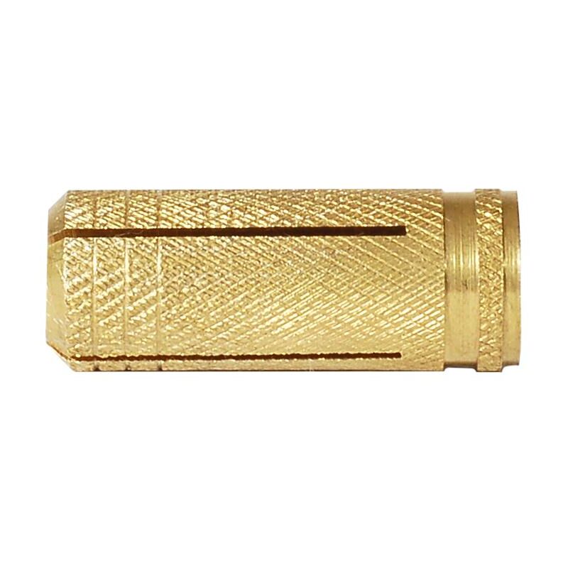 Tassello ad espansione con filettatura interna metrica, manicotto zigrinato, in ottone. Sottofondo: calcestruzzo, pietra naturale, mattone pieno e per diametri inferiori anche legno. Vantaggi - Caratteristiche: è possibile utilizzare bassa profondità di ancoraggio, resistenza alla corrosione e alle alte temperature, comoda installazione con viti con filettatura metrica, superficie zigrinata dell'ancorante, con conseguente migliore adesione alle pareti del foro e prevenzione della rotazione dell'ancorante durante l'installazione in molti substrati, dimensioni di ancoraggio più piccole - molto pratico per l'installazione su una superficie di legno, smontabile e rimontabile, l'espansione avviene serrando una vite o un'asta. Esempi di utilizzo: Fissaggio di elementi leggeri di arredo, mensole, portacavi, elementi strutturali in legno e metallo.
