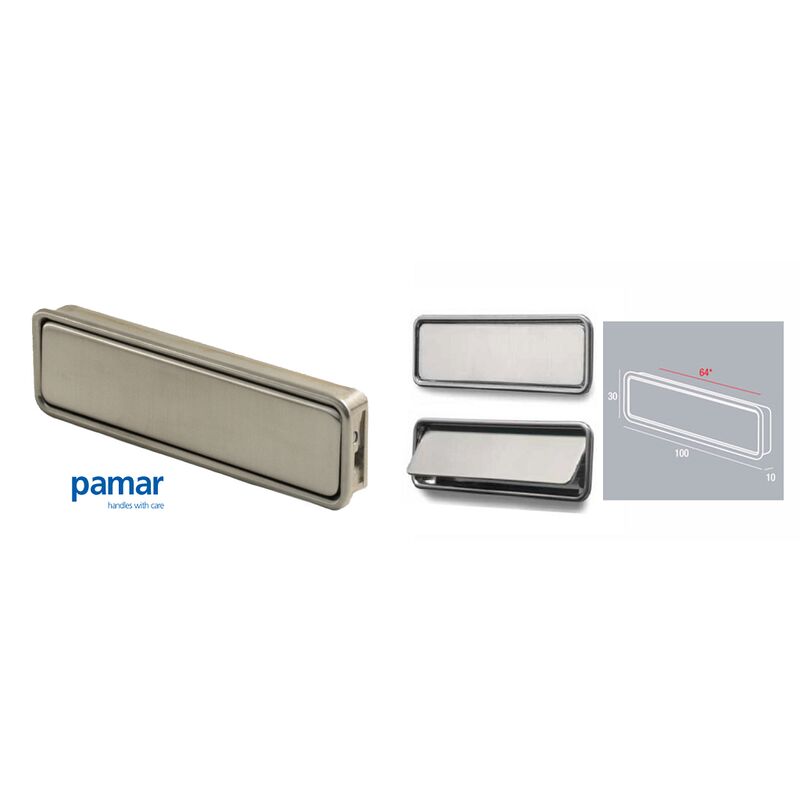 Maniglie da incasso per mobile/porte marca Pamar. Caratteristiche tecniche: -Materiale: Zama -Finitura Nichel Satinato Lucido -Interasse: mm.64 -Dimensioni esterne della maniglia: mm.100x30 -Misura fresata del foro di mm.100x30x10 -Con sistema apertura a pendolo La confezione comprende: - 1 Maniglia - Viteria ed accessori per il montaggio Perché scegliere Pamar ? Nell'Italia del primo dopoguerra, carico di problemi ma ricco di fermenti ed energie nuove, prende il via la storia di Pamar, una delle Aziende oggi di riferimento a livello mondiale, nella produzione di maniglie, pomoli ed accessori per mobili. L'impresa nasce e si sviluppa a Renate, in quella parte di Brianza che ben presto verrà riconosciuta come uno dei poli più evoluti nel settore della minuteria metallica e componentistica per mobili. Pamar è la concretizzazione del progetto di un uomo, Angelo Redaelli e della sua intraprendenza. L'imprenditore, accompagnato dal sostegno continuo della moglie Elena che partecipa