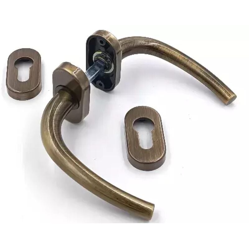 Maniglia GPB Milena in Ottone finitura Bronzata, con rosetta e bocchetta Ovale foro Yale . La confezione comprende 2 Maniglie, 2 Bocchette e il ferro quadro di collegamento ( foto ) Misure: Maniglia 120 mm Bocchetta 62 x 32 mm Colore: Bronzato