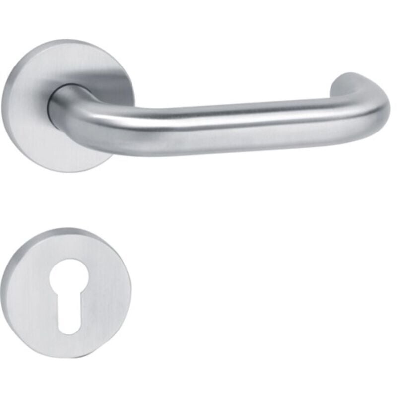 In H-Technik mit Rosetten nach DIN 18255 und DIN EN 1906 aus Edelstahl, bestehend aus: Türdrücker Modell 111X aus Edelstahlrundrohr (1.4301), Durchmesser 21,3 mm mit 1,5 mm Wandstärke, mit Ansatzführung und Rastnut, mit Madenschraube M5. Montage durch einfaches Einrasten der Türdrücker in die auf der Tür vormontierten Unterteile. Die Rastung kann mittels Demontageschlüssel wieder gelöst werden. Der Drücker erfüllt die Vorgaben der DIN EN 179 und DIN 18040. Rosettenunterkonstruktion in Kunststoff-Stahlverbundbau mit schwarzer Zink/Nickel Oberfläche für optimalen Korrosionsschutz, integriertes Hochhaltemodul mit Federunterstützung, DIN links und DIN rechts verwendbar. Festdrehbarlagerung der Drücker mit selbsttätig einrastender Rundumverriegelung und 5 mm Lagerstelle als wartungsfreies Gleitlager mit elastischem Ausgleichsbereich. Verdeckte, lockerungssichere Verschraubung mit M5 Edelstahlschrauben- und Hülsenschraubenkombination sowie Stützzapfen. Rosetten-Abdeck-Kappe, rund, aus