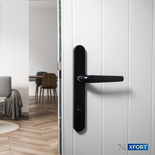 Maniglia per porta con meccanismo interno a molla, in PVC-U, distanza maniglia/serratura 92 mm, distanza tra centri di fissaggio delle viti 210 mm, con doppia smaltatura, set doppio, nero
