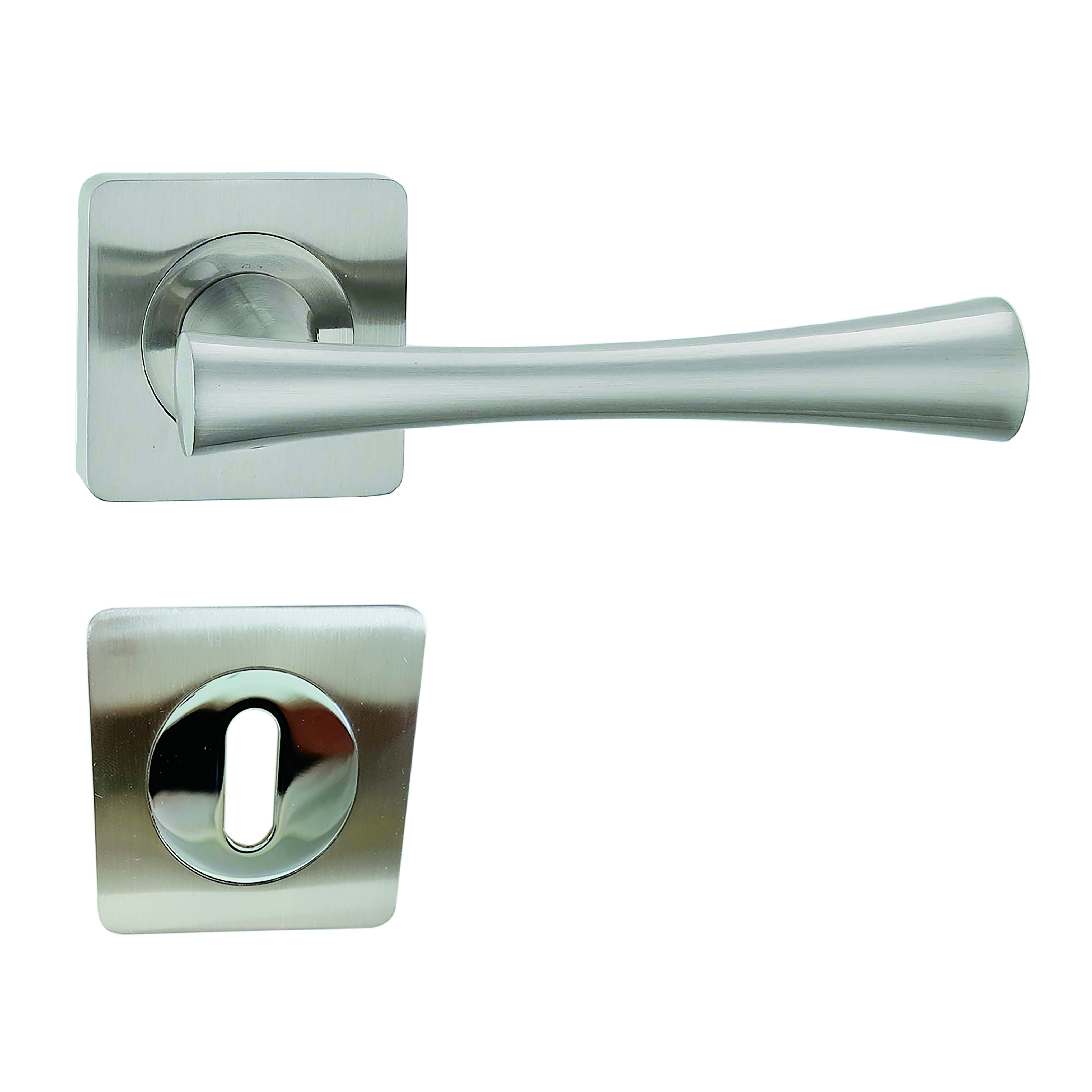 Maniglia con rosetta e bocchetta in Zama Cromo satinato. Indicata per porta da interno battente con serratura patent. Coppia di maniglie, due grani di fissaggio, chiave esagonale per grani, due bocchette, viti da legno, quadro Q8