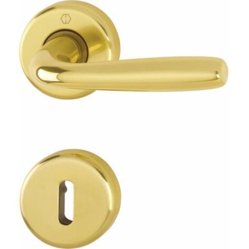 Maniglie Hoppe Maribor oro lucido In alluminio finitura oro lucido con rosetta e bocchetta. Misura quadro 8 mm.