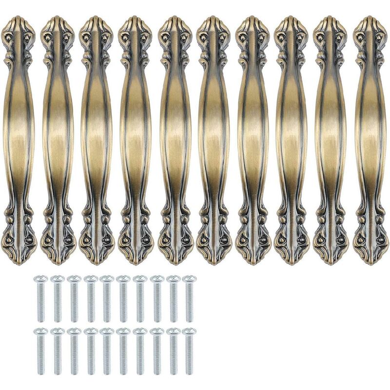Materiale del manico: lega di zinco. Colore: Bronzo verde placcato. Stile maniglie per mobili: lega di zinco in stile vintage europeo per ante di mobili e cassetti della cucina. Lunghezza maniglie: 110 mm. Altezza: 20 mm. Lunghezza: 15 mm. Distanza tra i fori della maniglia: 64 mm Utilizzo: Utilizzare su armadio, cassetto, porta, armadio ecc. Contenuto: Set di 10 maniglie fornite con viti della lunghezza adatta alle tue esigenze, incluse 20 viti da 22 mm.