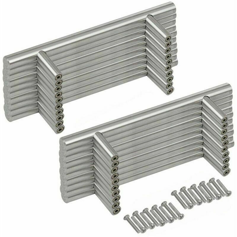 Lunghezza totale: 200 mm / Distanza tra i fori: 128 mm Diametro della barra: 12 mm / Altezza: 32 mm Materiale: acciaio inossidabile. La superficie è cromata e spazzolata. Contenuto della confezione: 20 maniglie per porta, 40 viti di montaggio (lunghezza: 25 mm), facile da montare. Questi mobili moderni si adattano perfettamente a diversi armadi e cassettiere in cucina, soggiorno, sala da pranzo e zona notte. Le maniglie sono di alta qualità e garantiscono una forma particolarmente bella ed elegante.