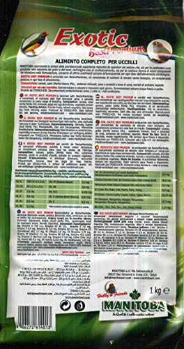 L'Exotic Best Premium è la massima espressione nutrizionale di una azienda leader nel settore dell'allevamento professionale quale è la Manitoba. Alla già ricca ricetta a base l'Exotic Best Premium somma un 3% di Perilla bianca (molto ricca in acido alfa-linolinico, è farmacologicamente considerata un forte promotore dell'interferone, e di stimolo al sistema immunitario), gusci di ostrica ed il 5% di NectarManitoba.