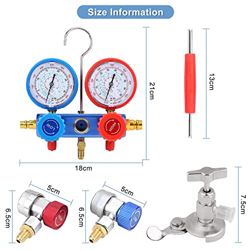【Doppio Manometro】 Viene fornito con 12 accessori, viene adottato un manometro a molla unico, più preciso per la lettura dei dati. Dotato di un robusto gancio per appendere i misuratori. Tubi di ricarica a tre colori lunghi 5 piedi