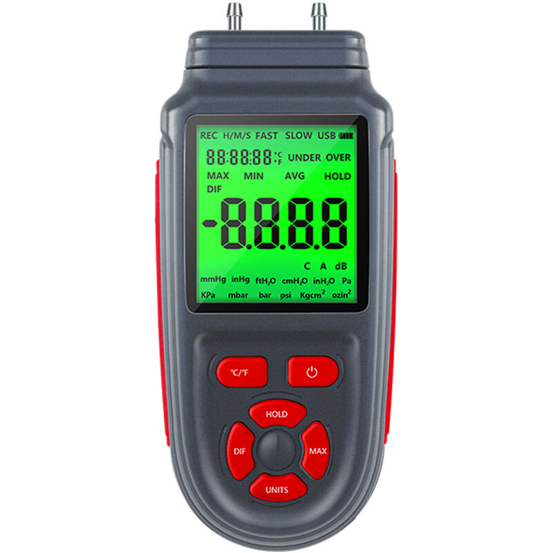 Altre funzioni -- Questo manometro differenziale digitale può essere utilizzato anche per la misurazione della temperatura e supporta la commutazione ℃/℉. Blocco dati/archiviazione dati (100 gruppi)/funzione ricerca dati, modalità dati massimo/minimo. cavo USB esterno. MCU a bassa potenza progettato. Spegnimento automatico dopo 15 minuti di inattività per risparmiare energia. Indicatore di batteria scarica da 6,8 V per un uso conveniente. prodotti ceramici, stampaggio biofarmaceutico, rilevamento della pressione nell'area mineraria, raffinazione petrolchimica, rilevamento della pressione di attrezzature industriali di gas, liquidi e produzione. Nota: 1. Il colore e le dimensioni possono essere leggermente diversi a causa della misurazione manuale e delle diverse condizioni di luce. Grazie per la comprensione. 2. Si prega di leggere attentamente il manuale dell'utente prima dell'uso. Specifiche: Modello e amp;