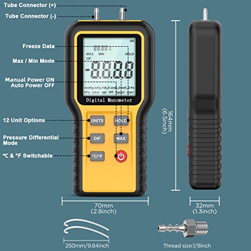 Manometro Digitale Palmare Professionale Manometro Differenziale Digitale per Gas Tester di Pressione del Gas HVAC Manometri Portatile con Connettore a Doppio Tubo, Ampio Display LCD e 12 Unità di