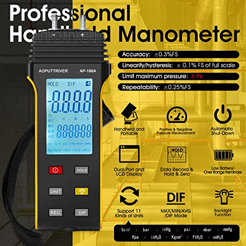 ✅ 【11 unità selezionabili】 Passa facilmente tra Psi, kPa, Kgfcm2, ozin2, Bar, mbar, inHg, mmHg, inH2O, ftH2O e cmH2O; Continua a lavorare come un professionista, ampiamente utilizzato nelle seguenti applicazioni: misurazione del flusso, qualità dell'aria monitoraggio, misura di livello, termometria del gas e controllo del sistema HVAC.