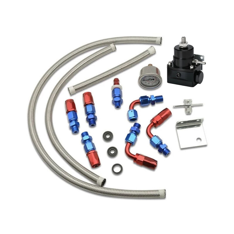 SPECIFICA:Materiale: alluminio (regolatore) + acciaio inossidabile (tubo) + alluminio (raccordi)Suppotr applicazione ad alta potenza: 300-800HPManometro carburante: 1-3/4 "| Diametro 45mm, porta NPT da 1/8"Lunghezza dei tubi del carburante: 200mm e 400mm e 700mmRegolatore di pressione del carburante Bypass iniettato con ingresso-6 AN e ritorno-6 ANCARATTERISTICHE:- MATERIALE:I raccordi e il regolatore sono realizzati in alluminio lavorato a CNC di alta qualità. Il tubo del carburante in acciaio inossidabile 304 e gomma sintetica CPE.- FUNZIONE:Il regolatore di pressione del carburante (FPR) può aumentare la quantità di iniezione del carburante senza cambiare il modello di alimentazione dell'olio, aumentare il livello di atomizzazione dell'iniezione di carburante e rendere completa la combustione del carburante, migliorare efficacemente la potenza e la coppia.- DESIGN REGOLABILE:Il regolatore di pressione del carburante è combinato con un manometro del carburante per regolare