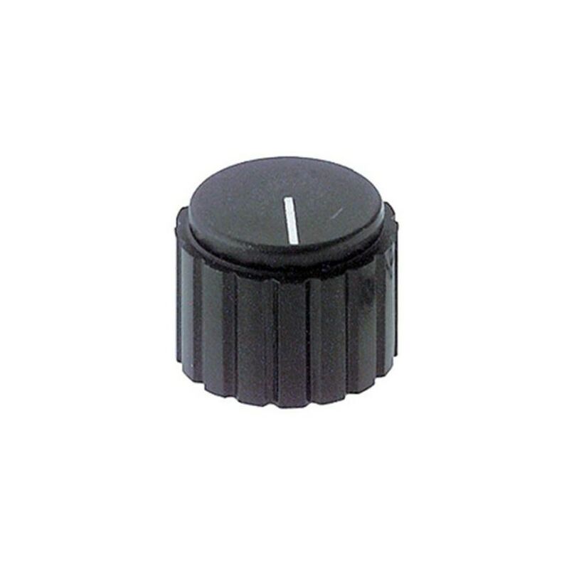 Manopola con indice modello151000. Innesto per perni diametro 6 mm. Bloccaggio mediante viti laterali. Materiale: PVC, cappuccio alluminio nero opaco. Dimensioni: diametro 20,0 mm x 15,2 mm di altezza.