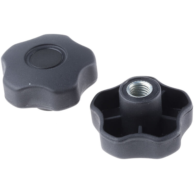 Filettatura = M12 Diamentro filettatura = 12mm Lunghezza filettatura = 18mm Forma manopola = Multi lobo Tipo di montaggio = Foro filettato Diametro manopola = 60mm Materiale inserto = Acciaio Colore = Nero Manopole a lobi multipli RS Pro in materiale. Le manopole sono utilizzate in un'ampia varietà di applicazioni nella nostra vita quotidiana ed eseguono molte funzioni, dall'utilizzo come maniglie fisse all'uso per serrare, allentare, regolare, bloccare e spingere altri componenti o componenti di apparecchiature. Sono utilizzate in varie applicazioni, dai macchinari industriali e per costruzioni alle apparecchiature audio e Visual. Questi volani a lobi multipli RS Pro hanno una forma ergonomica per garantire il comfort dell'utente, con un numero variabile di lobi a seconda della presa e della pressione richiesta. Le maniglie della manopola sono realizzate in corpi termoplastici resistenti agli urti e le manopole maschio sono dotate di un inserto a vite sporgente (maschio) in acciaio