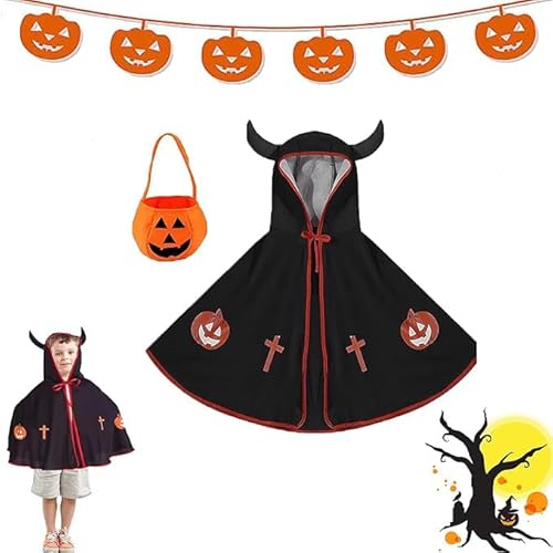 【Fashion Design】 Il Mantello per Bambini di Halloween ha due corno nella parte superiore e un'esclusiva stampa di zucca sui vestiti, che può arricchire l'atmosfera di Halloween e i bambini lo adoreranno moltissimo.2 colori del (rosso, nero) puoi scegliere, allo stesso tempo è con squisiti sacchetti di caramelle alla zucca.