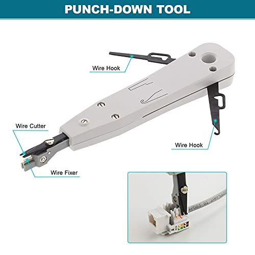 Attrezzatura completa - Un kit di utensili 18 in 1, che include un crimpatore per cavi di rete, un tester per cavi di rete, uno spellacavi per cavi di rete, un tagliafili, un cacciavite piatto e un cacciavite a croce, uno spellacavi di rete, uno strumento di punzonatura e teste RJ45(8P8C)/RJ12(6P4C), connettori, ecc. Questi attrezzi sono adatti per soddifare ogni esigenza rendendo la riparazione efficace.