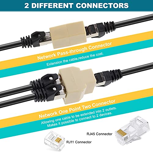 Connettori di tutti i tipi - La presa di rete singola a due connettori vi aiuterà a sopperire alla mancanza di lunghezza della linea della vostra telefonica o di rete, in modo da ridurre i costi senza aggiungere altri cavi e a non rovinare l'estetica . Il connettore di rete singolo a due slot, può realizzare una linea di rete con solo un cavo passante, crea una linea di rete su due computer entrambi collegati per navigare in Internet.