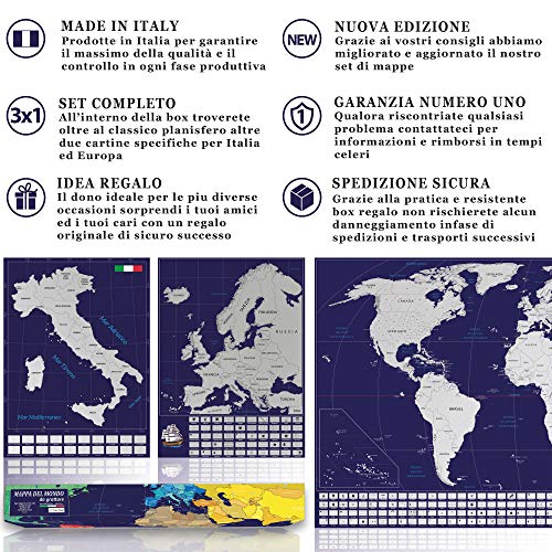 Mappa del mondo da grattare XL 82x44cm + mappe di Italia e Europa 33x23cm - Made in Italy - Idea regalo - Blu/Argento
