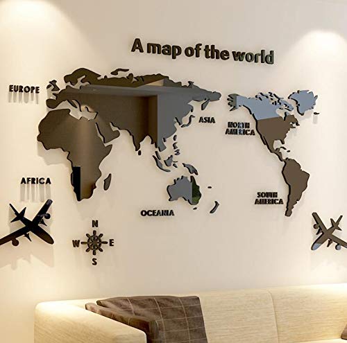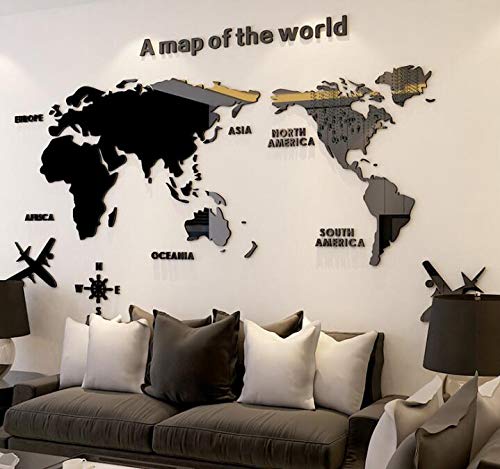 Marbeine - Adesivo da parete in acrilico 3D, motivo: mappa del mondo, colore: Nero