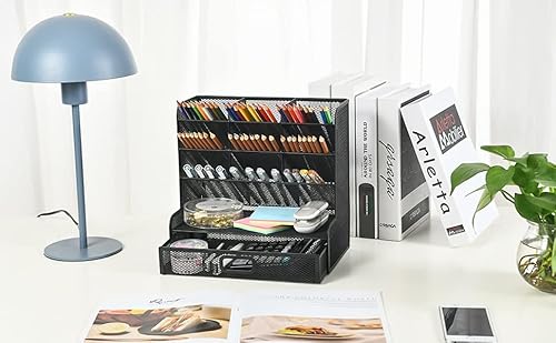 Marbrasse Organizer da scrivania in rete, portapenne multifunzionale, organizer per penne da scrivania, portaoggetti per materiale scolastico, casa, ufficio (portapenne nero con cassetto)