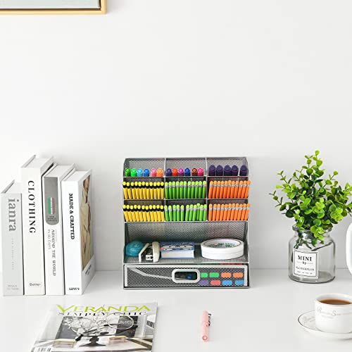 Marbrasse Organizer da Scrivania a rete, Portapenne Multifunzione, Organizzatore fisso da Scrivania, Rack di Stoccaggio per Materiale Scolastico per Ufficio a casa (portapenne argento con cassetti)