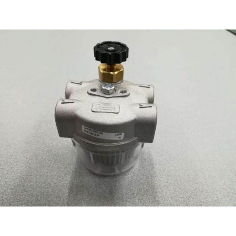 FILTRO GASOLIO 3/8 TRASPARENTE 2 VIECON RUBINETTO E VALVOLA DI RITEGNO Filtro gasolio a 2 vie con corpo in alluminio e vaschetta trasparente con attacco 3/8. Pportata massima di 40 kg/h. Cartuccia inox 0,1