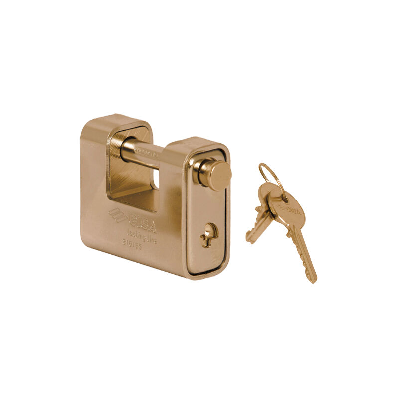 Corpo monoblocco in ottone con camicia in acciaio cementato nichelato, arco in acciaio cementato nichelato, piastrino di protezione del cilindro in acciaio carbonitrurato. In dotazione 2 chiavi