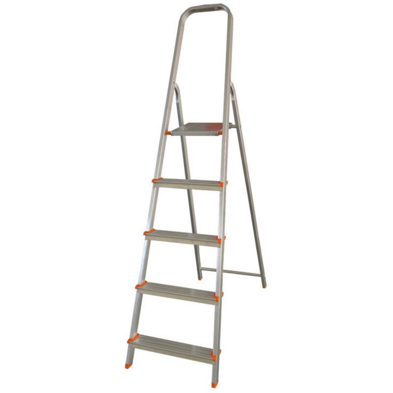 SCALETTO SCALA DOMESTICA Scala domestica mod. STELLA BASIC. In tubolare di alluminio mm 40x20, paracorpo ad arco chiuso 60 cm. Gradini antiscivolo larghezza 80 mm Portata max 150 kg N. gradini 5 Dimensioni: L169xP108xH184 cm Scala a norme europee EN 131