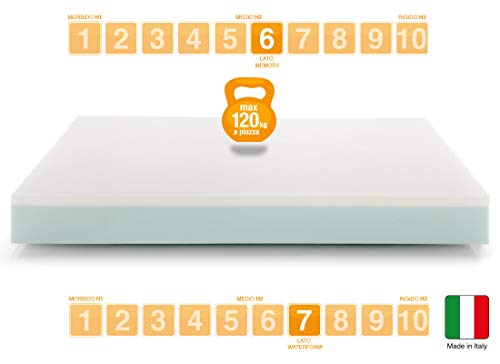 Memory Foam grado rigidità 6/10 (color bianco, lato da usare tutto l'anno) + WaterFoam grado rigidità 7/10 (color azzurro, lato da usare eventualmente nel periodo più caldo)