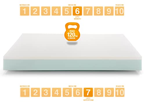 Memory Foam grado rigidità 6/10 (color bianco, lato da usare tutto l'anno) + WaterFoam grado rigidità 7/10 (color azzurro, lato da usare eventualmente nel periodo più caldo)