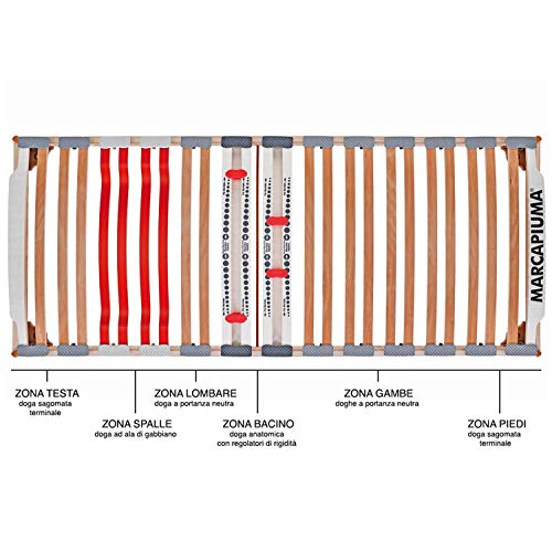26 doghe a listelli in legno di faggio curvato sezione 36x12 mm e nella parte centrale con doppie doghe e cursori regolabili per cambiarne la rigidità