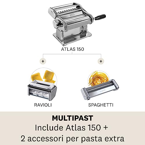 Marcato Set Macchina per la Pasta Atlas 150, Accessori Inclusi, Pasta Maker, Sfogliatrice per Pasta Fresca, per Lasagne, Fettuccine, Tagliolini, Ravioli, Spaghetti, in Acciaio Cromato.Modello Pastaset