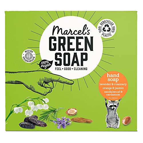 Marcel's Green Soap Set regalo con tre saponi per le mani, arancione, gelsomino, lavanda e rosmarino/sandalo e cardamomo, a base vegetale, ecologico, bottiglie riciclate - vegano
