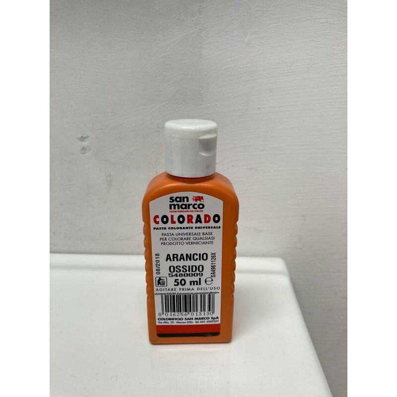 Paste coloranti Colorado pasta colorante arancio ossido lt 0,050 Colorado è una serie di paste coloranti ad alta concentrazione ed ampia compatibilità, ideali per la colorazione istantanea mediante semplice mescolazione di idropitture, tempere, rivestimenti plastici, pitture alla calce ed ai silicati, smalti sintetici ed oleosintetici, antiruggini e fondi sintetici, fondi idrodiluibili, da applicare all'interno ed all'esterno. le paste colorado sono dotate di elevata forza colorante che consente di ottenere tinte di tonalità forte utilizzando bassi quantitativi, lasciando inalterate le caratteristiche chimico-fisiche del prodotto cui vengono aggiunte. indicazioni di impiego e' necessario agitare il contenitore della pasta prima di utilizzarla e di mescolare accuratamente il prodotto verniciante dopo la colorazione. tutte le paste sono perfettamente miscibili tra loro e possono essere aggiunte direttamente al prodotto da colorare in un quantitativo massimo del 6% (in volume) di