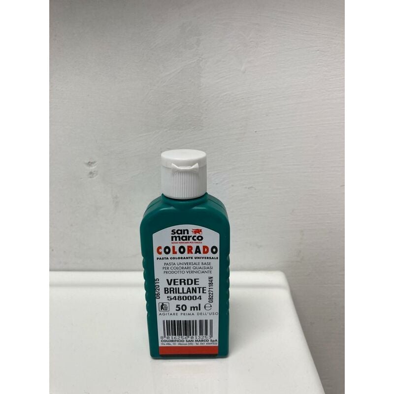 Paste coloranti Colorado pasta colorante verde brillante lt 0,050 Colorado è una serie di paste coloranti ad alta concentrazione ed ampia compatibilità, ideali per la colorazione istantanea mediante semplice mescolazione di idropitture, tempere, rivestimenti plastici, pitture alla calce ed ai silicati, smalti sintetici ed oleosintetici, antiruggini e fondi sintetici, fondi idrodiluibili, da applicare all'interno ed all'esterno. le paste colorado sono dotate di elevata forza colorante che consente di ottenere tinte di tonalità forte utilizzando bassi quantitativi, lasciando inalterate le caratteristiche chimico-fisiche del prodotto cui vengono aggiunte. indicazioni di impiego e' necessario agitare il contenitore della pasta prima di utilizzarla e di mescolare accuratamente il prodotto verniciante dopo la colorazione. tutte le paste sono perfettamente miscibili tra loro e possono essere aggiunte direttamente al prodotto da colorare in un quantitativo massimo del 6% (in volume) di