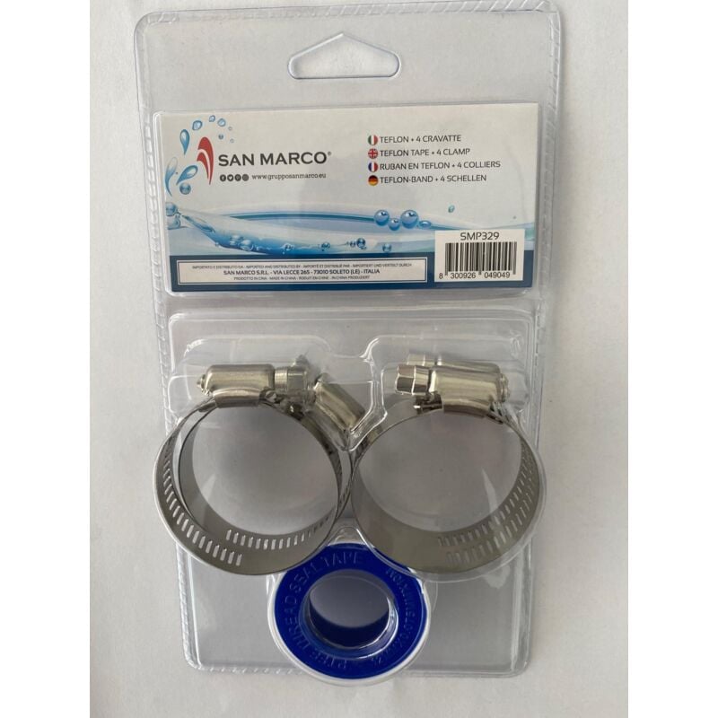 Nastro teflon con 4 fascette filtrazione per piscina San Marco Kit composto da un rotolo di nastro Teflon San Marco e 4 fascette di filtrazione per piscine fuori terra o interrate, dal diametro variabile da 32 a 38 mm. Accessorio adatto alla manutenzione, perfetto per unire e stringere i tubi della pompa filtro e delle bocchette.