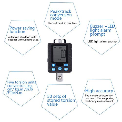 Funzione: l'adattatore di coppia ha una funzione di risparmio energetico. Si spegnerà automaticamente dopo 80 secondi senza usarlo. Il buzzer e la luce LED ti avviseranno. L'accuratezza della misurazione è dell'1%. Supporta misurazioni di terze parti.