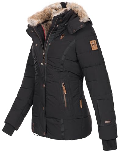 MARIKOO B658 - Calda giacca invernale da donna trapuntata con imbottitura in pelliccia sintetica, Nero, XS
