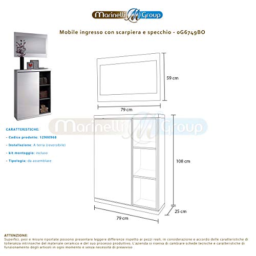 DIMENSIONI MOBILE: L 79 x P 25 x H 108 cm | DIMENSIONI SPECCHIO: L 79 x H 59 cm| APERTURA ANTA: su cardine metallico | QUANTITA' SCARPE: 9 paia