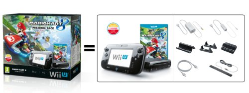 console Wii U Premium nera con 32GB* di memoria, un Wii U GamePad, la barra sensore e, cosa importantissima, il disco di gioco di Mario Kart 8 nel suo pack originale
