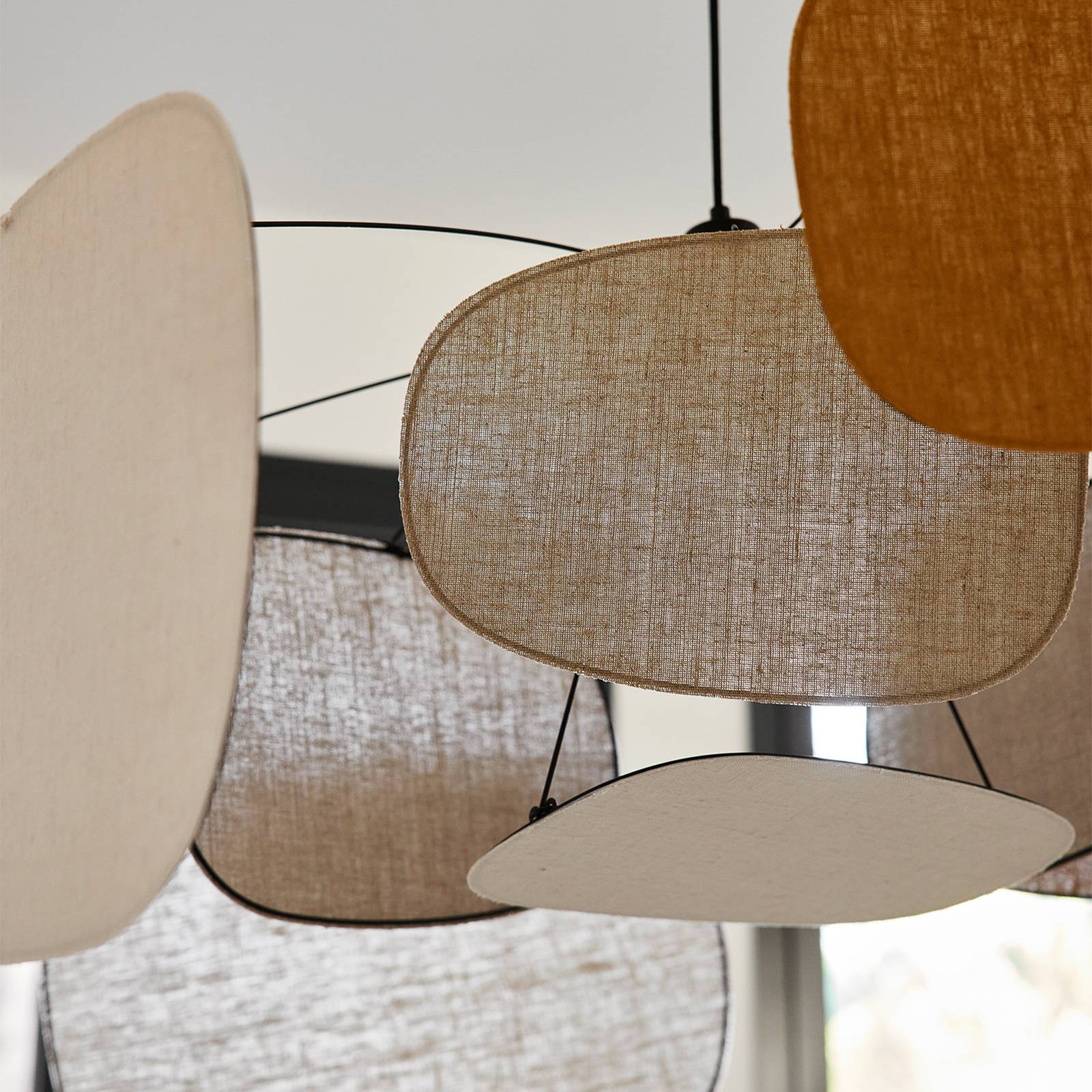 Apparecchio a sospensione monolampada Screen 70's linen textile panelsQuesto straordinario distributore di luce del marchio di design francese MARKET SET combina alla perfezione indipendenza e armonia. Il portalampada centrale è circondato da diversi pannelli in tessuto di lino nei toni pacati della terra, montati in diversi orientamenti e distanze. Gli elementi in tessuto sono leggermente traslucidi, creando un gioco di luci e ombre che cambia a ogni nuovo angolo di visuale. La tettoia e la struttura in metallo, così come il cavo rivestito in tessuto, sono di colore nero.