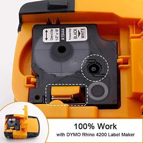 4 pack Equivalente al nastro per etichette DYMO Industrial Vinyl 18444. Dimensioni: 1/2 pollici x 18 piedi (12 mm x 5,5 m), Colore: nero su bianco.