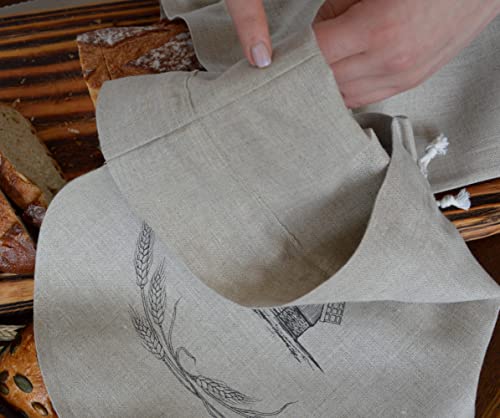 MARKUS Linen Set di 3-1x sacchetto di lino per il pane 34x45 cm + 1x sacchetto per baguette 18x70 cm + 1x panno di lino 38x55 cm - sacchetto di lino per il pane-riutilizzabile - stampato - 100% lino