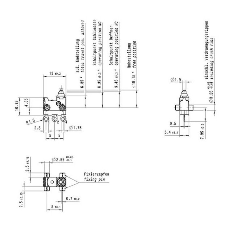 Dettagli tecnici Azionamento 1 tasto Collegamento (Componenti) Anello a saldare Contenuto 1 pz. Corrente di commut. max. 0.1 A Durata (meccanica) 200000 Funzioni (pulsante/interruttore) Momentaneo Materiale di contatto Au Temperatura (max.) 85 °C Tensione di commutazione 30 V/DC Tipo di protezione Lato azionatore IP67/Lato collegamento IP00 Tipo prodotto Microinterruttore