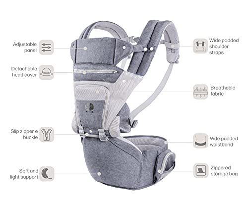 Marsupio neonati ergonomico con sedile hip seat mod. 2021, Porta-Bebè 4 Posizioni con cappuccio rimovibile/regolabile, da 4 a 20kg. Completamente traspirante con cotone traforato/antisudorazione.