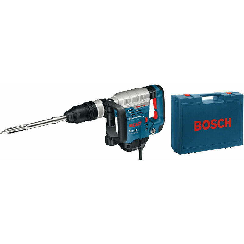MARTELLI DEMOLITORI BOSCH GSH 5 CE Attacco SDS-Max. Potenza 1.150 Watt, energia del colpo 8,3 Joule, n° colpi 1.300-2.900 giri/min., peso 5,8 Kg., sistema di ammortizzazione delle vibrazioni Vibration Control consente di lavorare comodamente anche in caso di impieghi prolungati, meccanismo Vario-block consente la regolazione dello scalpello su 12 posizioni, per lavorare senza sforzi. Dotazione: Impugnatura supplementare, scalpello a punta, valigetta