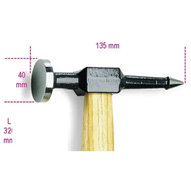 Martello con testa tonda piana e penna a punta manico in legno. Diametro: 40 mm Lunghezza: 320 mm Larghezza: 135 mm Testa: Tonda piana Impugnatura: Legno