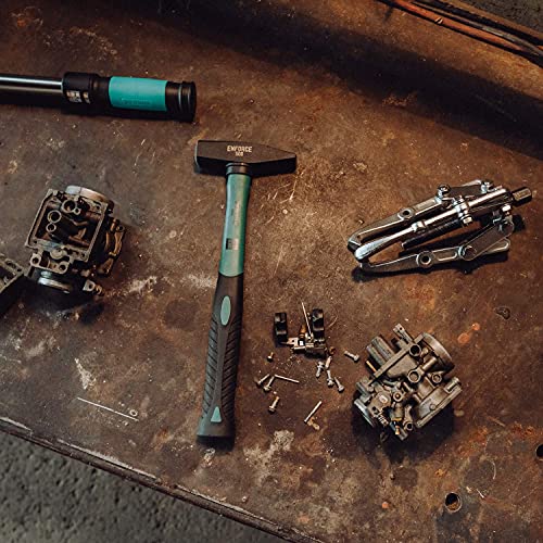 MARTELLO DA MECCANICO 500 GR - tipico martello tedesco altamente resistente con testa battuta della serie ENFORCE, realizzato secondo la norma DIN 1041. Il manico è più lungo per poter esercitare maggiore forza. La testa con affilatura di precisione ha una superficie di battitura di 7,3 cm². La distribuzione del peso tra punta e testa e la vetroresina a due componenti riduce le vibrazioni e aumenta la sicurezza.