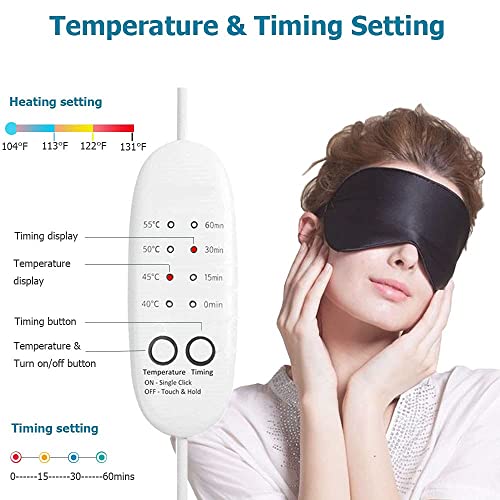 Diverse impostazioni di calore e tempo: la maschera per gli occhi riscaldata USB progettata con 4 classi di opzione di temporizzazione 0/15/30/60 minuti e 4 classi di impostazione della temperatura di riscaldamento da 40 ° C a 55 ° C (104 ° F - 131 ° F), puoi sceglierlo in base alle tue esigenze, l'indicatore a led rosso sul controller si accenderà dopo l'accensione.