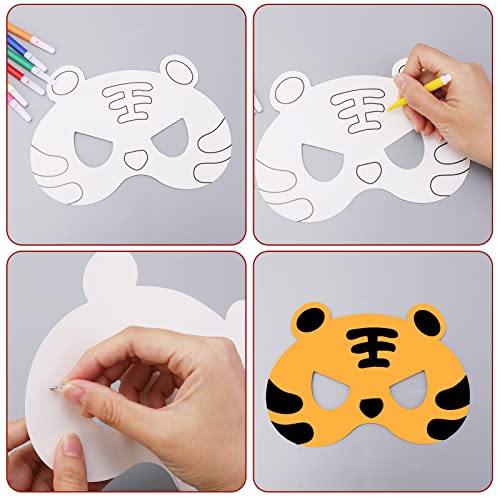 Maschere per Bambini, 9 Maschere Animali con Penne Colorate, Maschere da Colorare DIY con Corda Elastica, Maschera di Pittura di Carta Bianca Graffiti, per Festa Cosplay Compleanno Natale Halloween